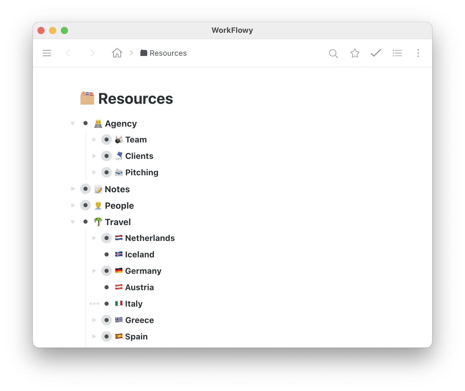 Resources are used to collect ideas on specific topics you’re merely interested in, ranging from product management to business strategy to gardening. In original PARA, Resources are organized very similarly to other categories. You create top-level folders or nodes for each topics and collect the stuff you like in them. So you’d set them up just like the Areas category in terms of taxonomy. The main different that resources aren’t actionable, they’re merely collections of notes and facts you want to preserve for future work.