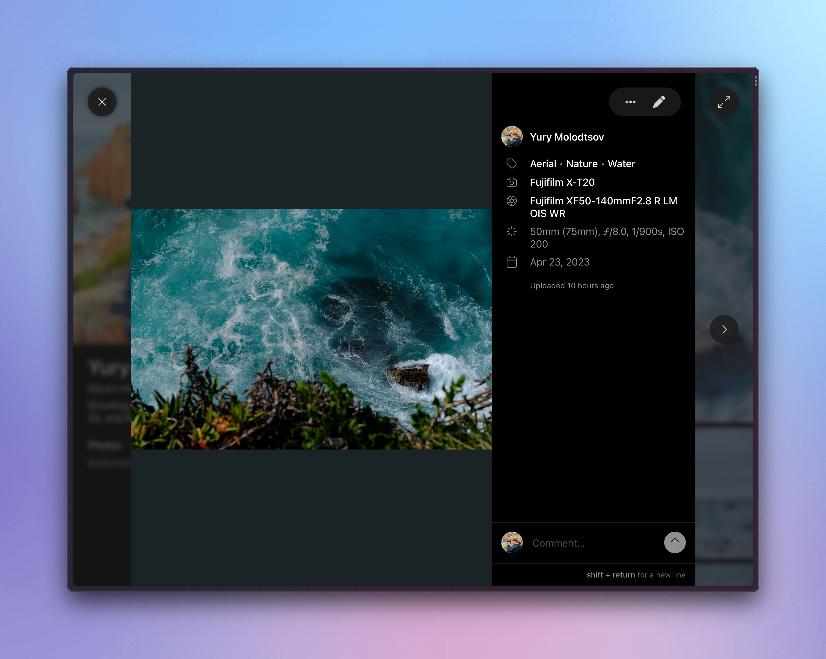 Your photos showcase EXIF information (unless you manually erased it). Helpful to get the context behind the shot and how it was taken. You can also search for photos shot on particular equipment.
