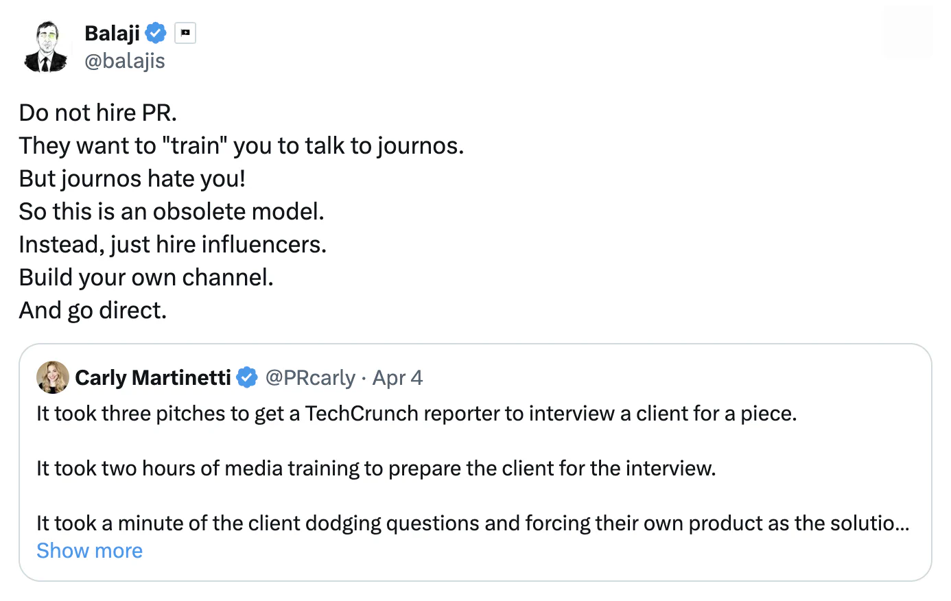 Of course, you don’t need to do PR in the traditional sense when you’re Elon Musk or Garry Tan. But even they use the media, they just don’t need to send out pitches because of their mass of followers. Recently, for the first time, Tesla started doing traditional press tours in Europe for the updated Model 3.