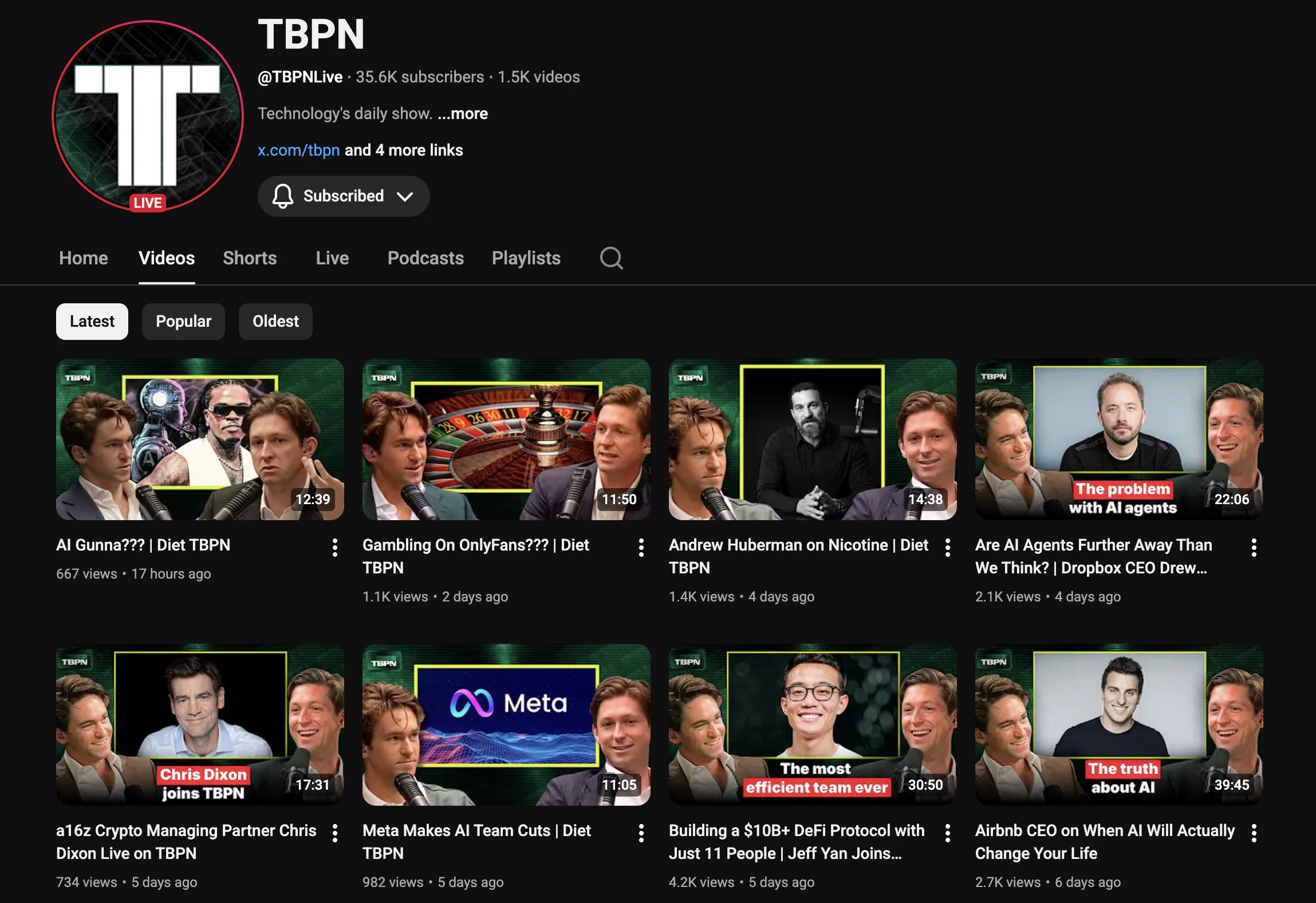 What I find fascinating is that despite being video-first, TBPN is fairly small on YouTube, with only 35k followers; most of their videos gather a couple thousand views, with one exception at 360k.