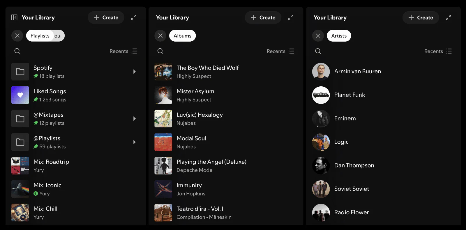 Create one playlist for your absolute favorites and don’t treat “Liked Songs” as a library; it’s just a collection bin. Then, create playlists for favorite artists and specific moods, like training or reading. There are buttons at the top allowing you to filter between Playlists, Artists and Albums in your Library persistently. Just use this.