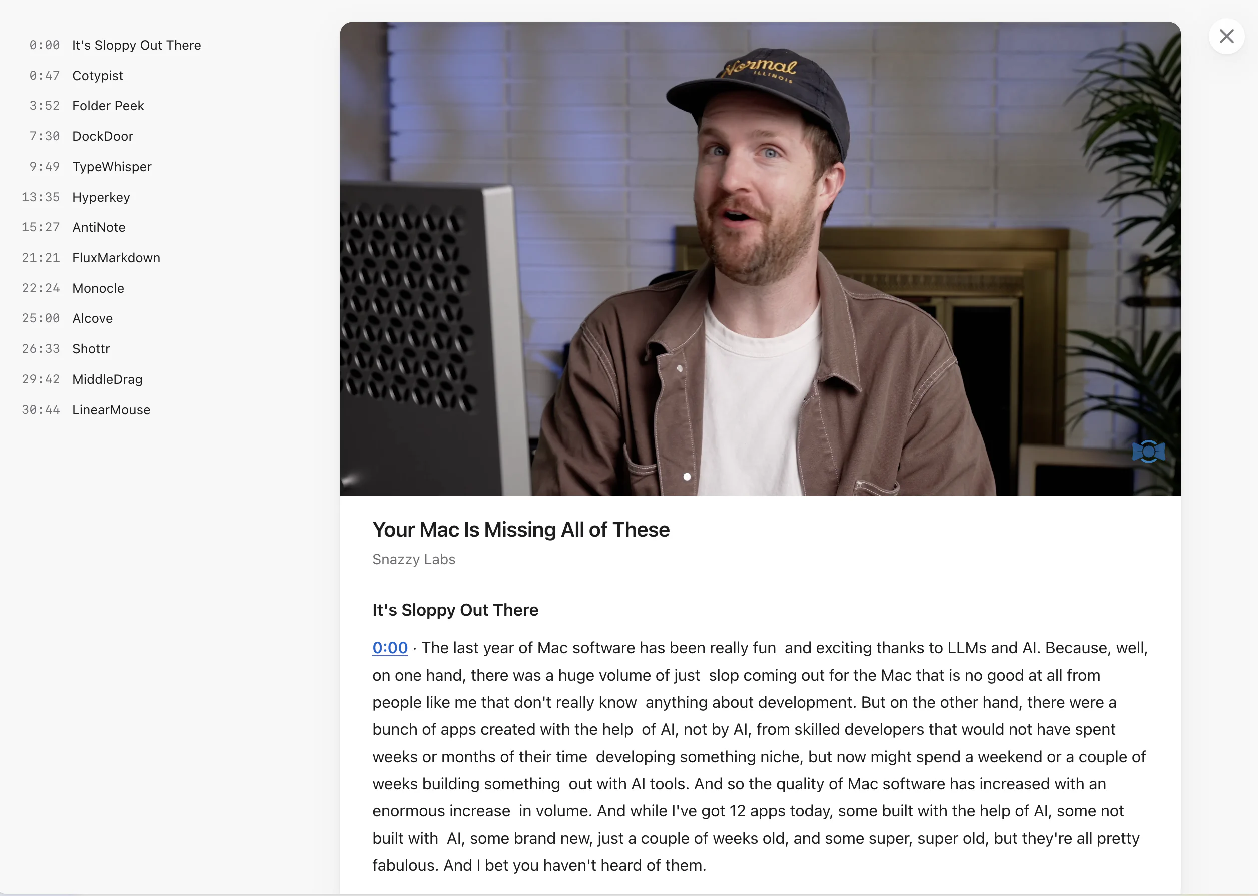 The extension also works on Twitter and transforms any threads into articles that you can easily skim with no UI noise. And in the last update, I added support for YouTube. Readr can now extract chapters and transcripts with clickable timer marks from videos that have those. It’s great for long podcasts where you want to find something specific and jump straight to that place.