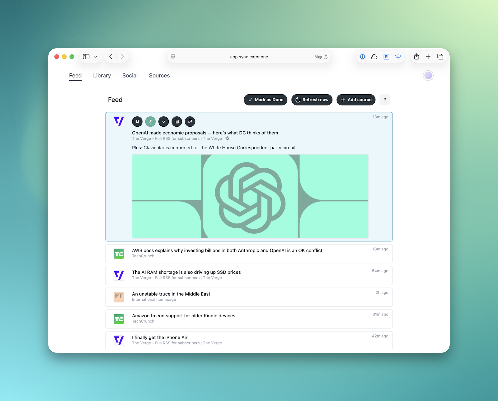 Syndicator is a ranked, personalized reading app. It pulls news sites, blogs, YouTube videos and Substacks into one place, then learns from what you actually read, skip, save, and share.